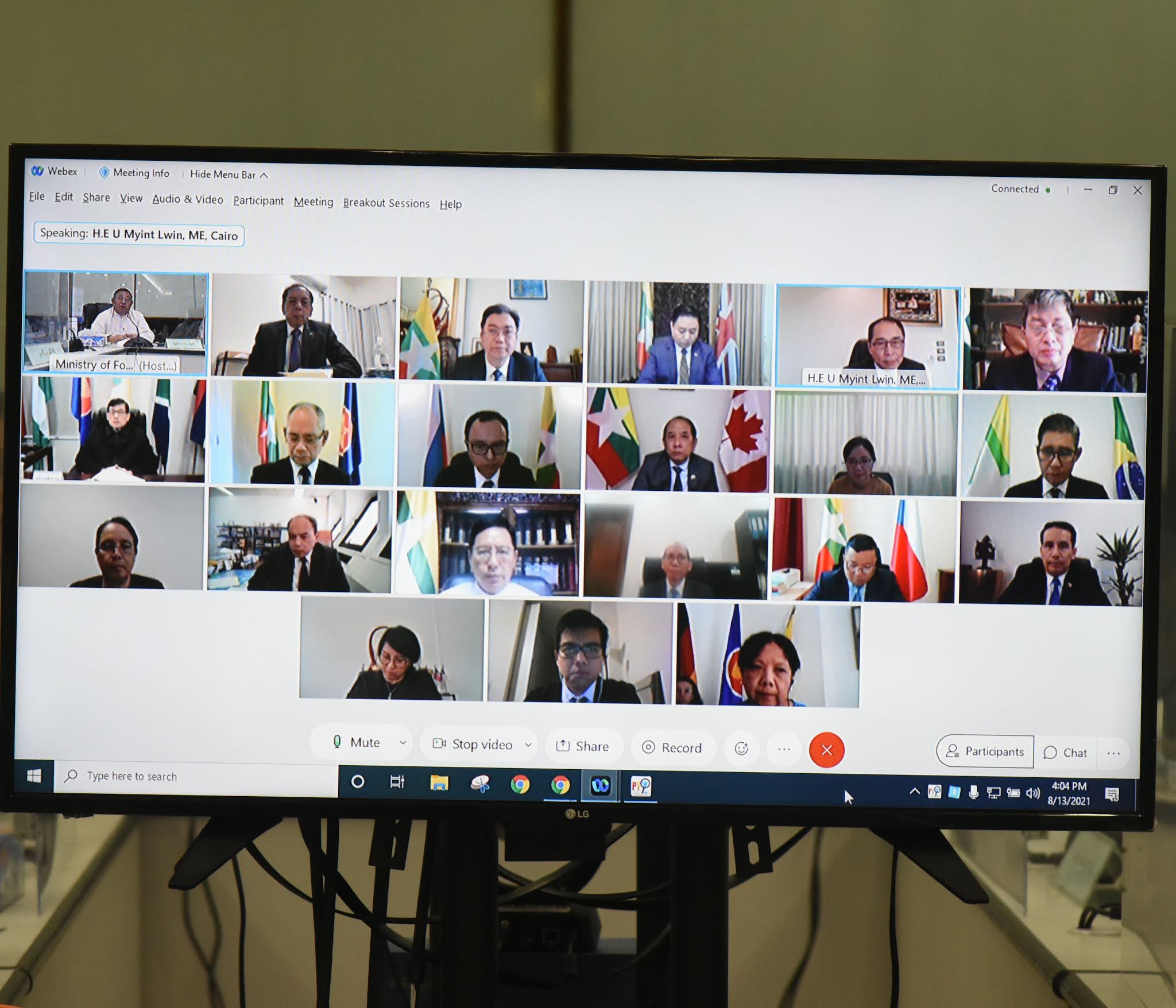 နိုင်ငံခြားရေး ဝန်ကြီးဌာန ပြည်ထောင်စုဝန်ကြီး ဦးဝဏ္ဏမောင်လွင်နှင့် အပြည်ပြည်ဆိုင်ရာ ပူးပေါင်း ဆောင်ရွက်ရေး ဝန်ကြီးဌာန ပြည်ထောင်စုဝန်ကြီးဦးကို ကိုလှိုင်တို့ဦးဆောင်၍ အရှေ့ အလယ်ပိုင်းနှင့် အာဖရိကဇုန်၊ ဥရောပဇုန်၊ အမေရိကဇုန်နိုင်ငံများရှိ မြန်မာသံရုံးနှင့် အဖွဲ့ရုံးများမှ မြန်မာ သံအမတ်ကြီးများ၊ အမြဲတမ်း ကိုယ်စားလှယ်များနှင့် သံရုံးအကြီးအကဲများကို လက်ရှိဖြစ်ပေါ် တိုးတက်လျက်ရှိသော နိုင်ငံရေး အခြေအနေများနှင့် ဆောင်ရွက်ချက်များအား အသိပေးရှင်းလင်းခြင်း ညှိနှိုင်း အစည်းအဝေးကို ယနေ့ ညနေ ၄ နာရီတွင် ဗီဒီယိုကွန်ဖရင့်စနစ် ဖြင့် နိုင်ငံခြားရေးဝန်ကြီးဌာန ဧရာဝတီခန်းမ၌ ကျင်းပသည်။
