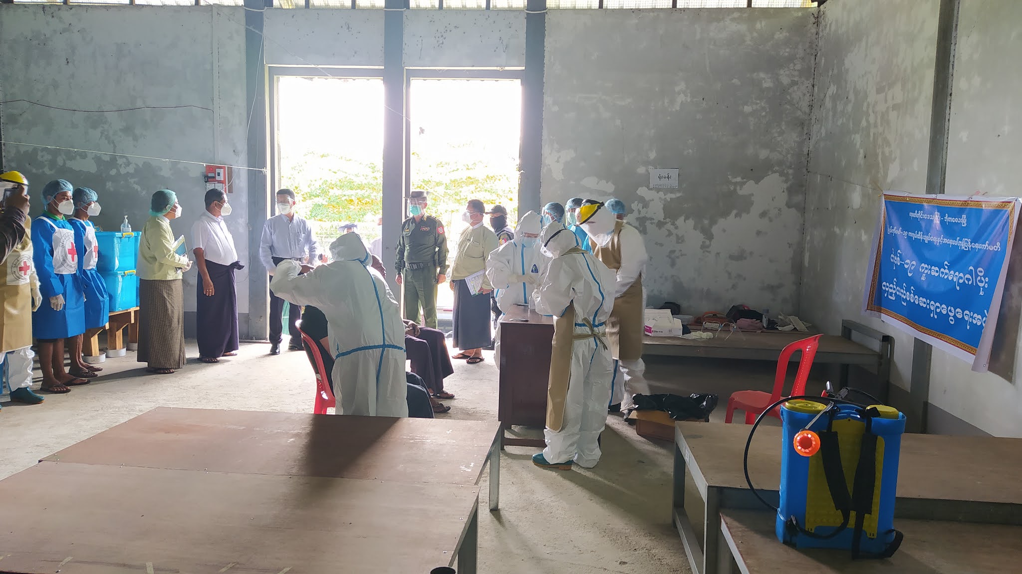 ဆက်လက်၍ မြို့နယ် ကိုဗစ်-၁၉ ကာကွယ်ထိန်းချုပ်ရေးနှင့်အရေးပေါ်တုံ့ပြန်ရေးကော်မတီ၊ ကိုဗစ်-၁၉ ကူးစက်ရောဂါပိုး လှည့်လည်စစ်ဆေးရှာဖွေရေးအဖွဲ့မှ မြို့နယ်ဘေးအန္တရာယ်ဆိုင်ရာ စီမံခန့်ခွဲမှု ဦးစီးဌာနရုံး၌ အမှတ်(၉)ရပ်ကွက်အတွင်းရှိ ပြည်သူများအား Test-Kit ဖြင့် ကိုဗစ်-၁၉ကူးစက်ရောဂါ ရှိ/မရှိ ရှာဖွေစစ်ဆေးနေမှုလုပ်ငန်း ဆောင်ရွက်လျက်ရှိရာ အဆိုပါ လုပ်ငန်း ဆောင်ရွက်နေမှုကိုလည်း ဧရာဝတီတိုင်းဒေသကြီးဝန်ကြီးချုပ်နှင့်အဖွဲ့မှ လှည့်လည်ကြည့်ရှု အားပေးခဲ့ကြောင်း သိရသည်။