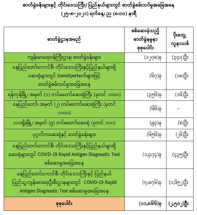 COVID-19 ရောဂါ ကာကွယ်ထိန်းချုပ်ရေးအတွက် တိုင်းဒေသကြီး/ပြည်နယ်များတွင် COVID-19ရောဂါကာကွယ် ဆေးကို ဦးတည်အုပ်စုများသတ်မှတ်၍ ထိုးနှံပေးလျက်ရှိရာ (၂၄-၈-၂၀၂၁) ရက်နေ့အထိ လူဦးရေစုစုပေါင်း (၄,၅၄၂,၃၆၃) ဦးအား ထိုးနှံပေးပြီးဖြစ်ပြီး၊ ကာကွယ်ဆေး နှစ်ကြိမ် အပြည့်ထိုးနှံပြီးစီးသူ (၁,၇၉၇,၅၅၀) ဦး နှင့် ပထမအကြိမ်ထိုးနှံပြီးစီးသူ (၂,၇၄၄,၈၁၃) ဦး ရှိပြီဖြစ်ပါသည်။