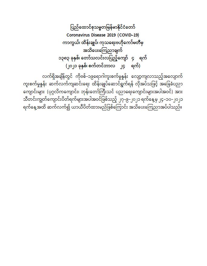 Coronavirus Disease 2019 (COVID-19) ကာကွယ်၊ ထိန်းချုပ်၊ ကုသရေးဗဟိုကော်မတီမှ အသိပေးကြေညာချက်